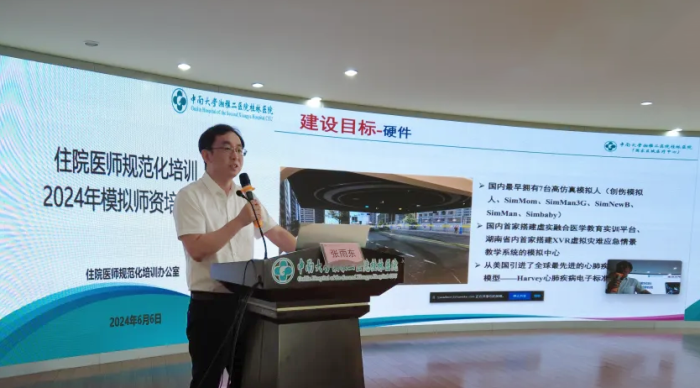 中南大学湘雅二医院驻桂专家、中南大学湘雅二医院桂林医院临床技能训练中心主任张雨东向参会人员简要介绍了医学模拟中心情况,详细讲解了住院医师单项技能模拟培训要点,并为大家带来了备受好评的精品课程《医患沟通:坏消息告知》。张雨东主任所授知识点实用,且紧跟医学教育前沿,互动性极强。