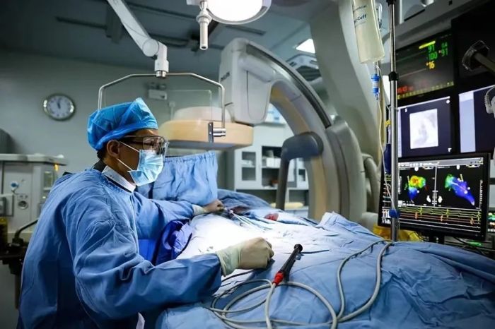 由于谭爷爷年事已高,心内科一病区团队在术中小心翼翼,注重每一个细节。手术通过标测电极及导管进入左心房,在三维指导下进行操作。由于现今导管具备压力显示及AI参数,使得微创手术的安全系数高,并发症少。在局麻和适当的镇痛药物辅助下,手术顺利进行并成功转为窦性心律。