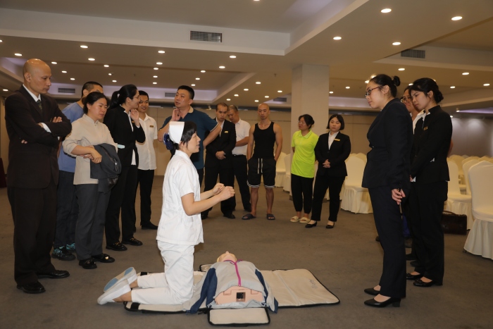南溪山医院急诊科主任陈锋通过生动的案例和实用的操作演示,向大家传授了心肺复苏和海姆立克急救知识。讲座结束后,南溪山医院的专家们现场指导酒店职工进行心肺复苏实操训练。桂山华星酒店的健身房、关怀大使、前厅部、餐饮部、客房部、保卫部等部门的员工积极参与,认真学习了急救技能。职工们纷纷表示,这次实操培训让他们更加熟悉了急救流程,提高了应对突发事件的能力。