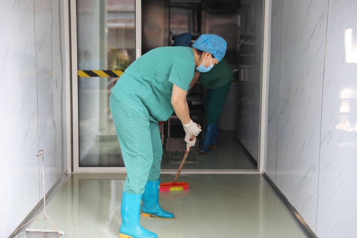 为保障人民群众的身体健康与生命安全,创造安全、放心的就医环境,医院积极开展全方位、无死角的环境消杀防疫工作。医护人员、后勤职工、保洁人员带着高压水枪、扫把等工具,对路面淤泥进行了地毯式清扫,将各类物资、设备归回原位;医院感染管理科工作人员现场指导调配消杀药水、指导消杀工作。大家齐心协力、分工明确,受洪水影响的住院部、药房、住院收费窗口等部门迅速恢复正常运行状态。