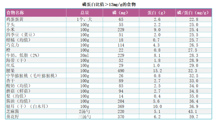 磷/蛋白比值大于12mg/g的常见食物参考表:
