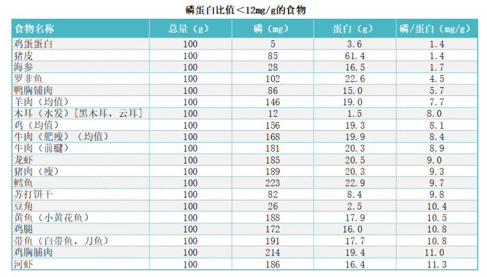 磷/蛋白比值小于12mg/g的常见食物参考表: