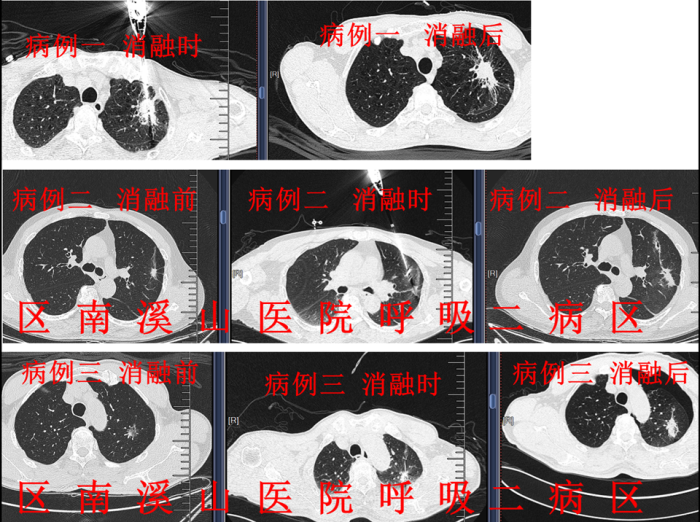 3名患者均为老年人,年龄大、体质差,心肺功能不适合再次行开胸大手术,经我科微波消融治疗团队对病例进行讨论,精心设计穿刺路线,在影像学科和麻醉科医生协助下,短时间内完成了3台手术。术中患者未述明显疼痛,返回病房后,翻身及下床都完全自如。