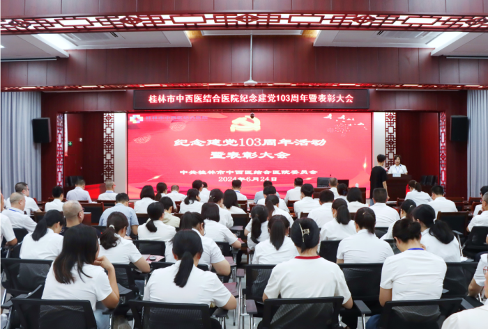 百年铸辉煌,奋进新时代。为学习宣传贯彻党的二十大精神,扎实开展“五基三化”深化行动,进一步增强基层党组织的创造力、凝聚力和战斗力,增强广大党员的荣誉感、责任感和使命感。6月24日,桂林市中西医结合医院党委召开庆祝中国共产党成立103周年暨迎“七一”表彰大会系列活动。党委领导班子成员、党支部书记、支委、全院中层领导干部以及党员代表等160余人参会。