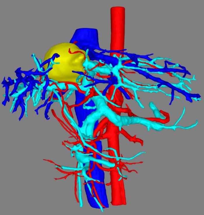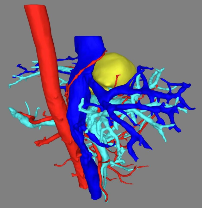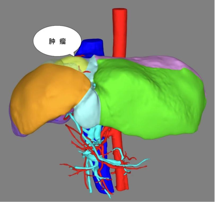 患者杨女士因右上腹阵发性胀闷不适1周,外院诊断肝血管瘤。就诊于南溪山医院。经肝脏超声造影、上腹部CT等检查提示:肝Ⅳ、Ⅴ、Ⅷ段肿瘤(考虑腺瘤)。