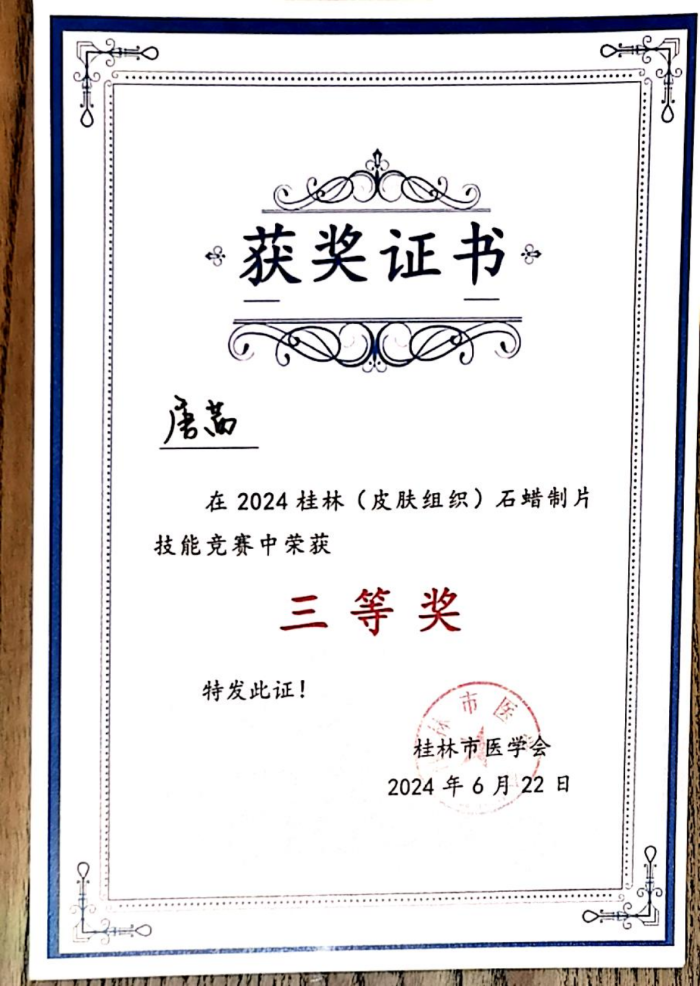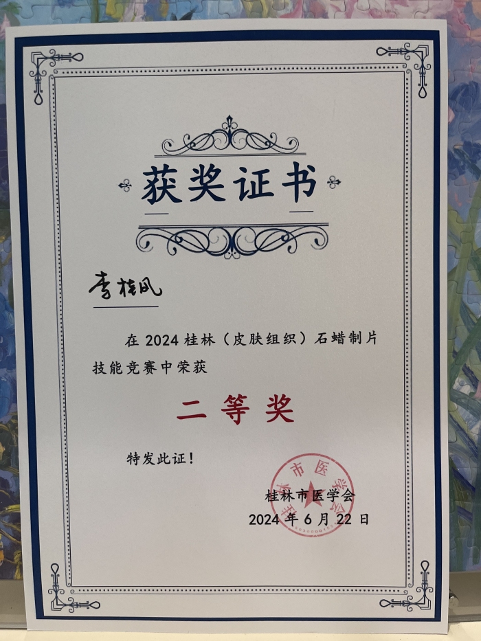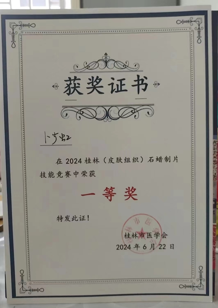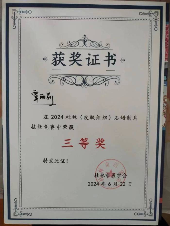 6月22日,桂林市医学会举行2024年桂林(皮肤组织)石蜡制片技能竞赛。桂林市中医医院病理科团队喜获佳绩,技术员卜少虹荣获竞赛一等奖,李桂凤荣获二等奖,唐茜、覃丽莉荣获三等奖,实现技术组全员参赛、全员获奖。