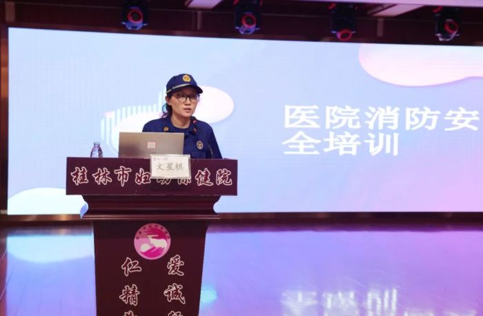 叠彩消防救援大队消防宣传员文星棋以《医院消防安全》为题进行培训,她以近年来典型的消防案例引入,并结合自身消防安全工作的实战经验,对火灾定义与危害、如何有效灭火、火灾的预防等方面内容进行了深入浅出的分析。她强调,遇到火灾等突发事件要冷沉着静应对,用正确的方式方法进行应急逃生,并提醒大家要切实提高消防安全意识,学会使用消防面具、灭火器等消防用具正确使用方法,当好安全生产第一责任人。
