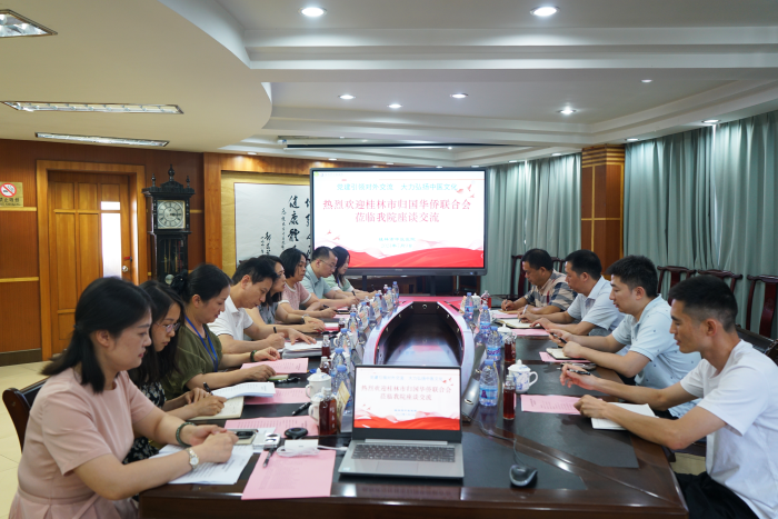 7月9日下午,桂林市侨联党组成员、副主席孟耀光率队一行4人到桂林市中医医院开展"党建引领对外交流,大力弘扬中医文化"交流座谈。医院党委书记唐刚健、党委副书记张筱栩、副院长冯丽平出席座谈会。