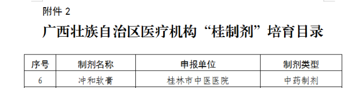 冲和软膏:由紫荆皮、石菖蒲等中药组成。本方为中医传统经验外用药方,来源于古代经典名方。广西名老中医欧奇在此方基础上结合本地特色药材化裁而得,具有活血散淤、消肿止痛的作用,用于阴疽风湿性关节痛、陈旧性跌打损伤。