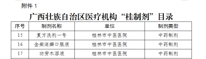 近日,在自治区中医药局等5部门开展的医疗机构“桂制剂”遴选工作中,经过设区市推荐、专家评审、部门审定等环节,确定了23个医疗机构制剂纳入自治区医疗机构“桂制剂”目录,其中桂林市中医医院3个中药制剂榜上有名,分别是:“复方洗剂一号”、“金柴消癖口服液”、“功劳木溶液”。另外确定了9个医疗机构制剂纳入自治区医疗机构“桂制剂”培育目录,其中桂林市中医医院“冲和软膏”中药制剂入选。