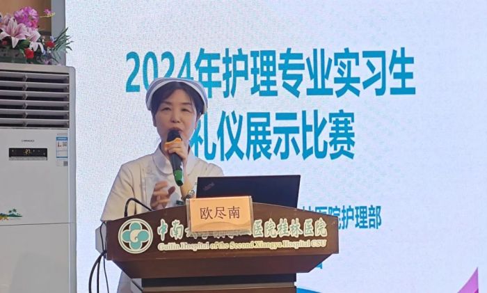 欧尽南对此次护理专业实习生岗前培训进行总结,她对本次礼仪展示比赛取得优异成绩的小组及个人表示祝贺,肯定了人文礼仪与服务工作小组教师的精心带教。欧尽南指出,良好的护理礼仪是护患关系的开端,是护患沟通与服务的桥梁,也是个人魅力的体现。她希望全体护理实习生以此次礼仪展示比赛为载体,把人文关怀和护理礼仪践行到临床护理工作各个环节,展现白衣天使的最美形象,做一个有温度的护理人员。