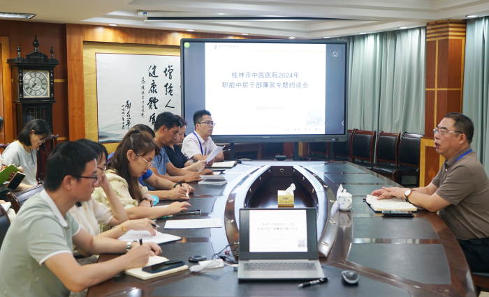 7月29日下午,桂林市中医医院组织召开了2024年职能中层干部及重点、敏感岗位人员廉政专题约谈会。医院职能中层干部,廉政高风险等重点、敏感岗位人员共49人参加约谈会,医院党委副书记、纪委书记黄泽旗出席会议并讲话。