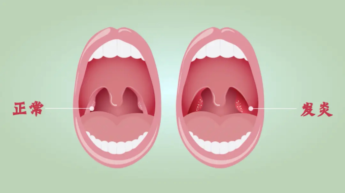 慢性扁桃体炎可引起反复咽痛、咽部不适、刺激性咳嗽、口臭;扁桃体反复肿大可导致扁桃体肥大,使患儿吞咽困难,说话含糊不清。如细菌毒素被吸收,可有头痛、四肢乏力、容易疲劳或低热、消化障碍等表现。在免疫力下降与扁桃体炎反复发作的协同作用下,容易形成病灶,患儿常有厌食、呕吐、消化不良及营养不良等症状。
