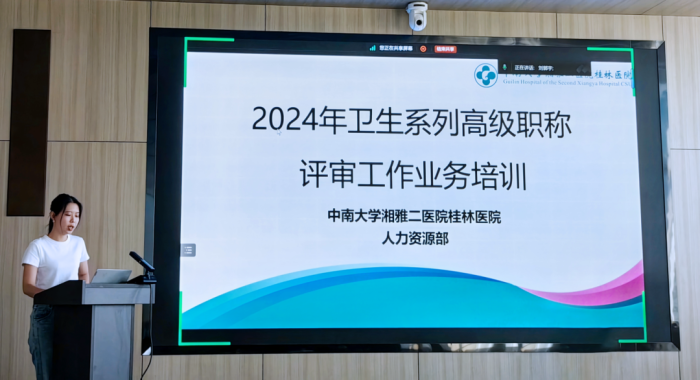 近日,中南大学湘雅二医院桂林医院2024年度卫生系列高级职称评审工作业务培训在临桂院区综合楼九楼会议室举办。此次培训旨在帮助医院参与2024年度卫生系列高级职称评审人员了解职称申报流程、材料准备要点以及评审标准。培训内容包括2024年度卫生系列高级职称评审政策的最新要求、系统申报的填写规范以及常见问题解答等。培训由人力资源部组织开展,线上线下共80余人参与。
