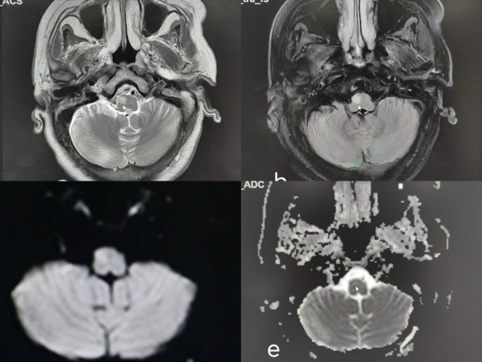 8月1日,患者复查头颅磁共振结果显示,右侧延髓T2WI、FLAIR、DWI呈高信号,ADC呈稍高信号