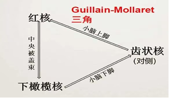 1931年Guillian和Mollaret首次描述了齿状核-红核-下橄榄核环路并将其与HOD联系起来,故此环路也称为Guillian-Mollaret解剖三角。