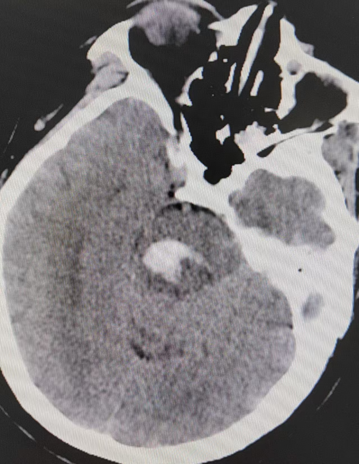 患者3月30日头颅CT平扫结果显示其右侧脑干出血