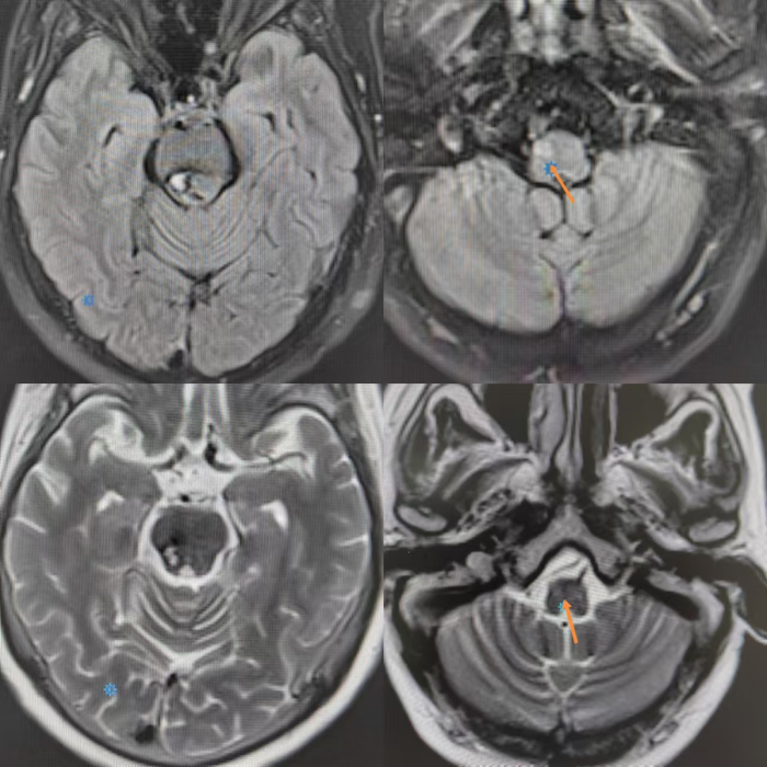 神经内科执行主任申向民教授详细询问患者病史,并为其进行全面的神经系统体格检查,仔细查阅患者既往头颅影像学表现,迅速组织团队为患者安排了头颅磁共振检查,结果显示——患者头颅右侧延髓下橄榄核区域出现肿胀,表现为T2和T2FLAIR高信号影,脑桥和中脑区域可见陈旧性出血改变。