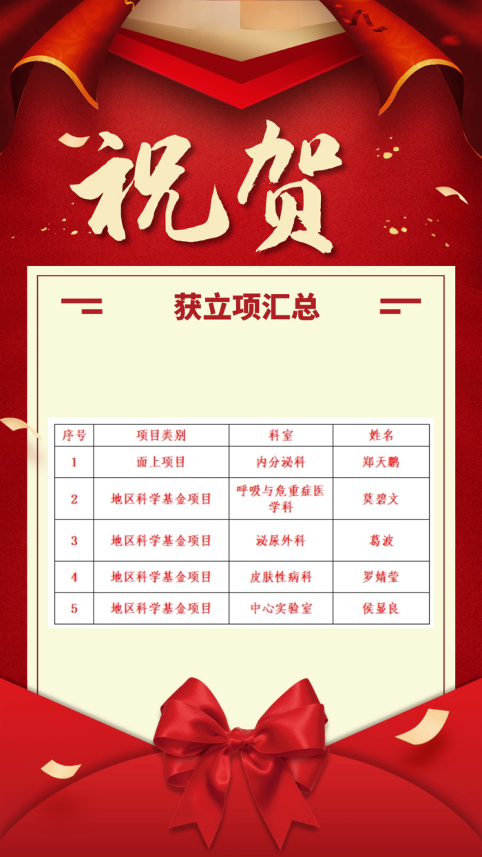 近日,国家自然科学基金委公布了2024年度国家自然科学基金项目的评审结果,桂林医学院第二附属医院职工成功斩获5项立项资助,其中包括1项面上项目,总资助经费176万元,立项数目和立项金额创近三年新高。