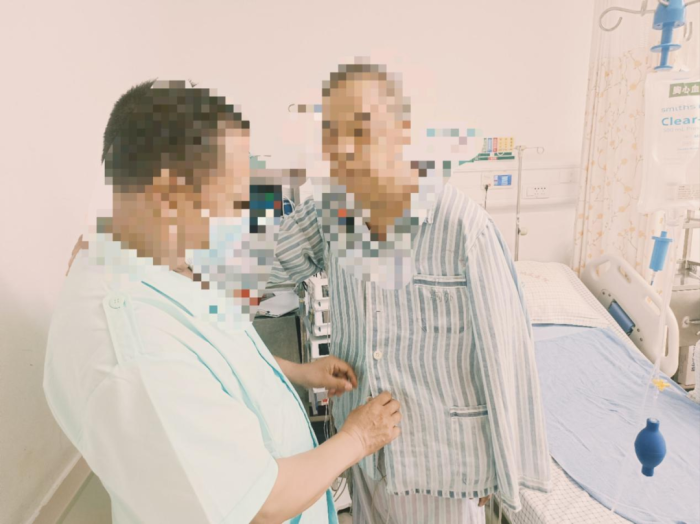 65岁的杨叔叔,在无明显诱因下出现胸闷、气促、心慌等不适来医院就诊,心脏彩超提示:左房、左室大;主动脉瓣中、重度返流,主动脉瓣窦部及升主动脉增宽;左室收缩功能减低;左室舒张功能不全;患者既往有高血压3级(极高危)、肺炎、腰椎间盘膨出、胆囊息肉样病变、右肾囊肿、肾功能不全、高尿酸血症,经过检查,针对杨叔叔基础疾病多,考虑到杨叔叔的年龄、身体状况以及家属对开胸手术的担忧,胸心血管外科展宇飞副主任及其团队深入讨论和评估,最终,决定为杨叔叔实施体外循环下微创Bentall手术,通过这种手术方法及秦旺喜护士长带领的护理团队专业及精心的护理下,患者术后病情平稳。