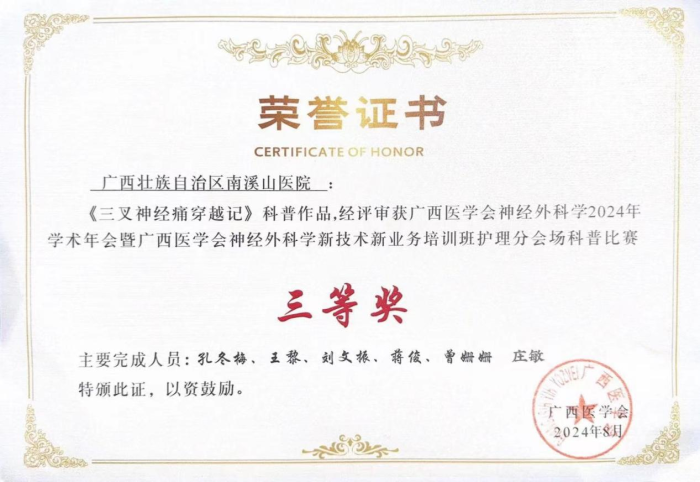 同时,自治区南溪山神经外科护理团队在广西《神经外科护理科普技能比赛团队赛》中获得了三等奖。这一成绩不仅是对南溪山医院神经外科护理团队的肯定,也是对医院整体护理水平的认可。通过比赛不仅锻炼了选手们的临床护理实践能力,还在比赛中明确了护理专业规范的重要性,为今后工作的创新发展提供了指导。不断提升自身能力,进一步改善了护理服务,为持续提升患者就医体验增添了助力。