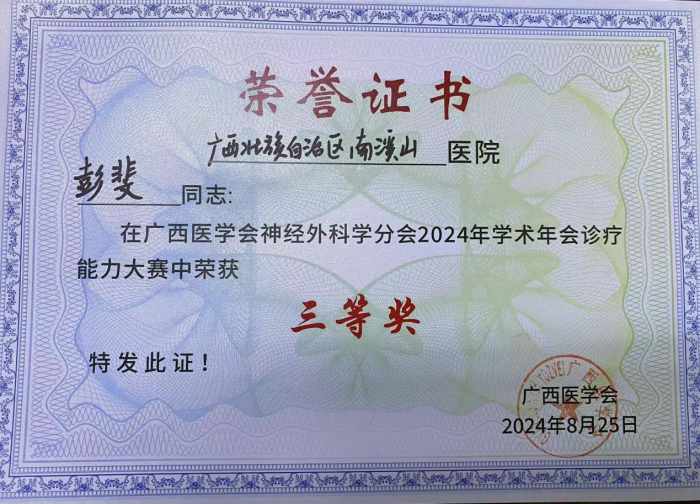 为促进广西地区神经外科领域的学术交流,提升该领域内的临床诊疗水平与科研能力,本次大会诚邀了国内外在神经外科及相关领域享有盛誉的专家学者。与会者将从学科发展的深层次问题入手,进行深入的交流与借鉴,共同探索广西神经外科领域的新发展与新思路。作为年会核心环节的诊疗能力大赛,吸引了众多杰出的神经外科医师参与竞技,他们在此平台上展示了自己在临床诊疗方面的卓越才能。自治区南溪山医院神经外科的彭志柱医师荣获“诊疗能力大赛”二等奖,彭斐副主任医师荣获三等奖。自治区南溪山医院神经外科团队在年会上展示了其在神经系统疾病治疗方面的先进技术和研究成果,赢得了与会专家的一致好评。