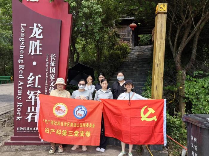 当天下午,自治区南溪山医院妇产科第三党支部书记陈玲丽带领支部党员们赴龙胜县红军岩红色教育基地开展主题党日活动。支部书记陈玲丽首先向大家讲述了当年红军长征过龙胜的感人事迹,随后,带领党员们参观红色教育基地,岩石壁上的“红军绝对保护傜民”、“继续斗争,再寻光明”的激昂语句至今依然清晰可见,展示了红军保护人民群众的决心。