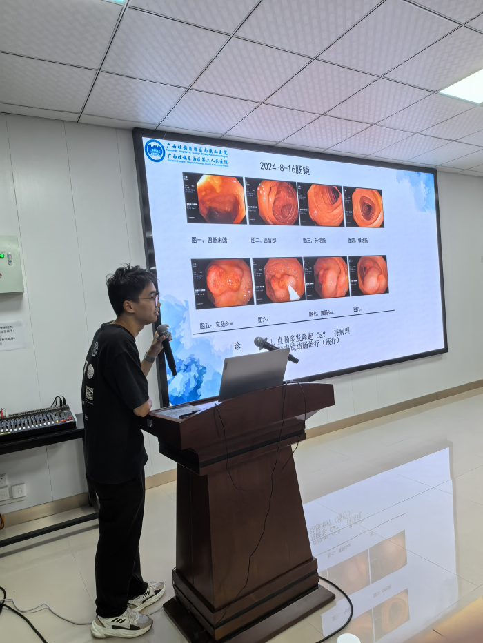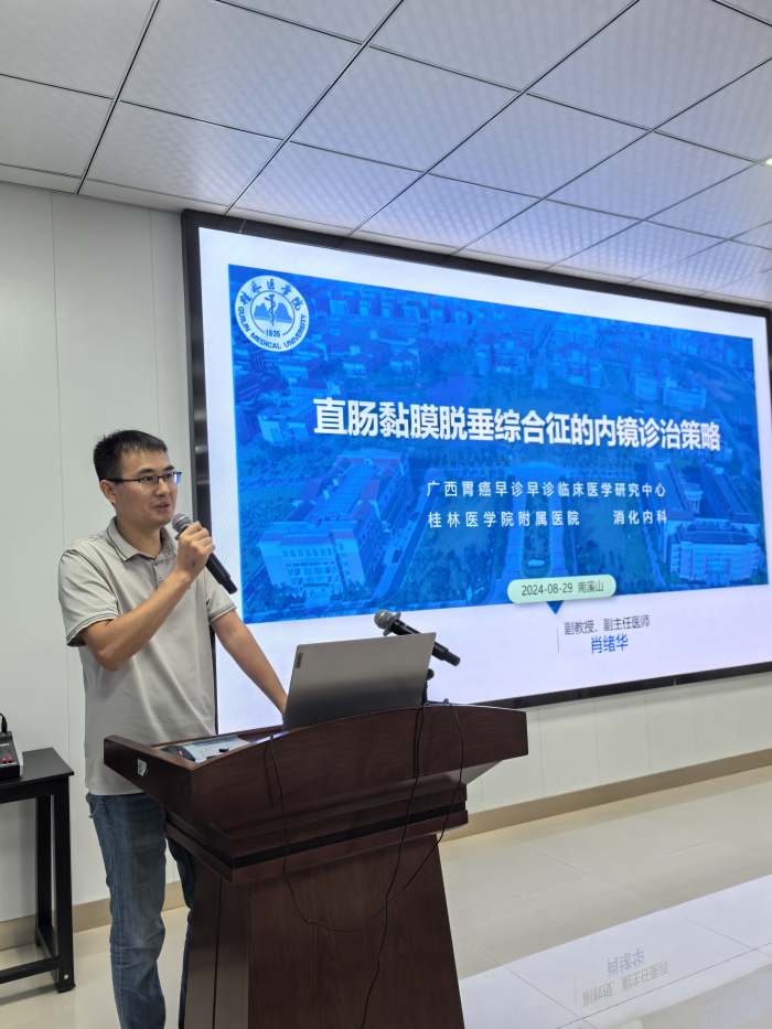会议首先进行专业理论知识讲座学习,分别由本院消化内科潘炜副主任医师、病理科李运千副主任医师、桂林医学院附属医院消化内科肖绪华副主任医师讲解直肠黏膜脱垂综合征临床及病理相关专业知识及诊治进展。之后,进入实战病例分享阶段,由自治区南溪山医院消化内科秦建华医师及病理科邓小丽、黄田喜医师讲解病例特点,戴劲主任、李运千主任、肖绪华主任及全体参会人员进行病例讨论。