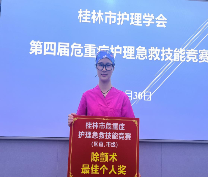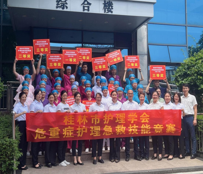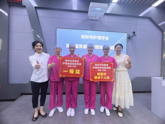 8 月 30 日,第四届危重症护理急救技能竞赛在桂林医学院盛大启幕,本次竞赛由桂林市护理学会主办,桂林市医学院附属医院承办。在这场紧张激烈的角逐中,广西壮族自治区南溪山医院危重症护理团队以精湛专业技能、扎实理论功底及卓越团队协作,从众多参赛队伍中崭露头角,荣获区直、市级团体一等奖,呼吸与危重症医学科二病区选手张童芳荣获除颤术最佳个人奖。南溪山医院四年蝉联一等奖,充分彰显了医院在危重症急救护理领域的卓越水平。