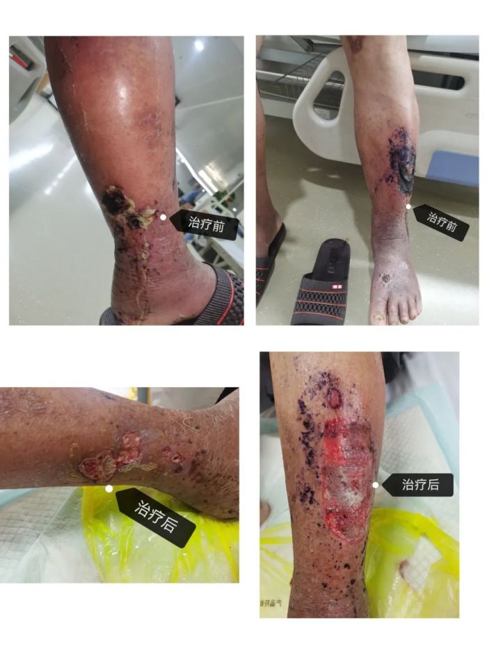 另外是一位是糖尿病并发下肢感染的爷爷,长期血糖控制不佳,冬日烤火不慎烫伤小腿,院外治疗效果差,创面越来越宽、肿胀明显,逐渐出现恶臭,如若不尽快规范治疗很有可能出现败血症、骨髓炎、截肢等恶化情况,陈桂艳医师耐心解释沟通病情及注意事项、每日细心为其清创换药,经过住院治疗创面有所好转,两夫妻很感激的出院了。