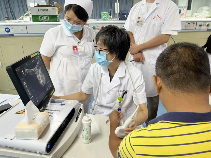义诊当天,专家团队细致地为血透患者诊察病情,耐心地解答他们的疑问,并对症状明显、病因明确的患者开处方、指导其合理用药。肾病科蒋背乐主任凭借其丰富的手术、临床经验,为患者进行了血管条件的评估,通过病史询问和身体检查,为患者提供手术方案建议。同时,专家团队还免费为恭城县中医医院血透室患者开展了内瘘筛查工作,对于内瘘流量欠佳的患者,及时发现潜在问题,并给出针对性的解决方案;对于流量尚佳的患者,则进行了内瘘日常护理宣教,指导患者如何有效保护自己的“生命线”,受到了患者们的一致好评。