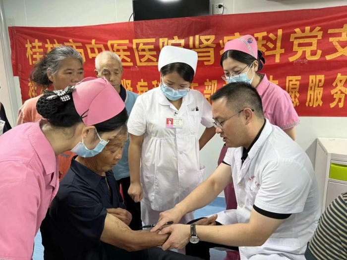 为庆祝第七个“中国医师节”,满足群众医疗需求,近日,桂林市中医医院肾病科专家团队赴恭城县中医院开展“关注血管通路,保护血透患者生命线”义诊活动。