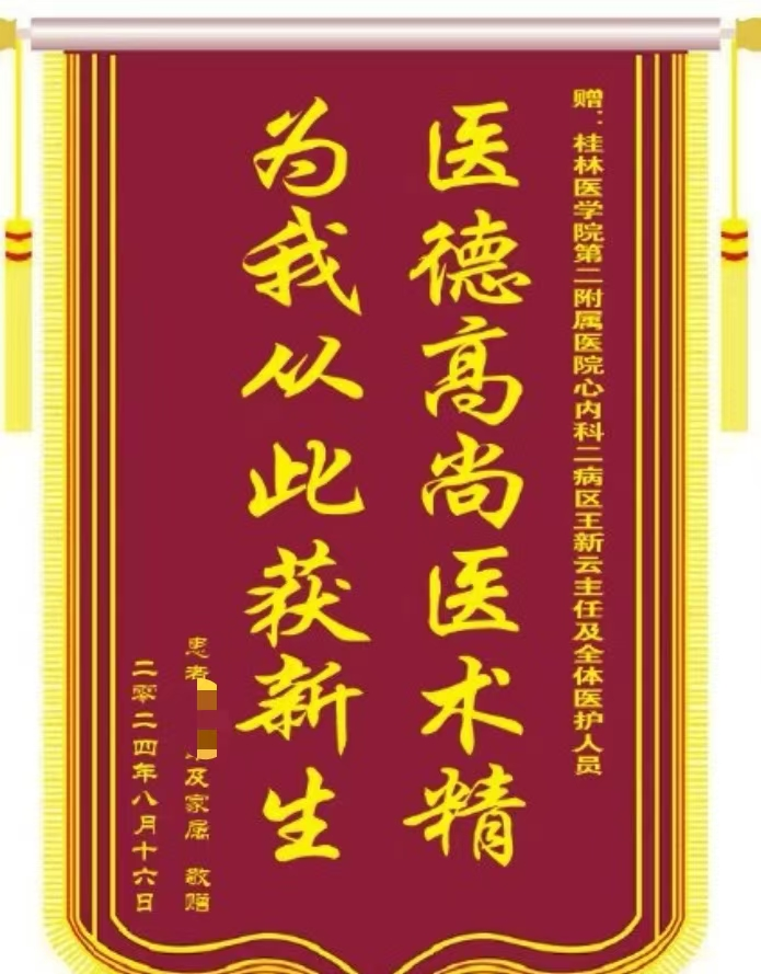 术后患者恢复良好,术前一般步行300米左右可诱发心绞痛发作,术后目前患者快速步行3-4公里无心绞痛发作,心功能也得到明显改善,提高了患者生活质量,为了表达感激之情,患者及家属特意定制了一面锦旗,上面写着“医德高尚医术精 为我从此获新生”,以此传递他们的谢意。