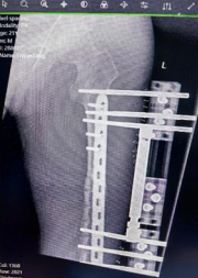 在Ilizarov外固定支架的保护下,患者的运动功能被完好地进行了保留,且左腿每天都在加速“生长”。通过几个月的康复训练后,李先生再次到医院进行左股骨延长术后钢板内固定+拆除外固定支架术。术后唐继全查看患者左腿肢恢复情况,并叮嘱他一定要做好术后康复锻炼,早日恢复肌体功能。