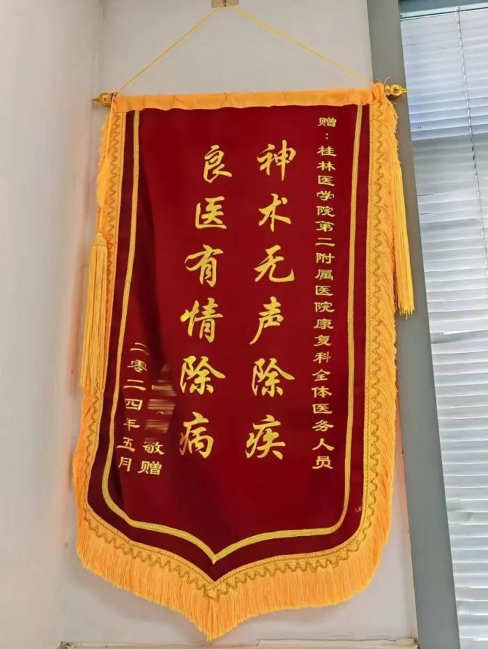 患者,曾某,因右侧肢体活动不利,言语含糊入住我科,经过一个疗程的治疗后,右上肢协调控制能力、右手精细协调功能均较前好转,可以自主吃饭,独自行走,言语含糊,由入院时单字变成可说出一长句话。出院的时候,特意来到医生办公室感谢医护人员的努力及帮助。