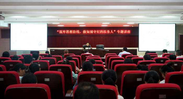 张文波书记围绕“筑牢思想防线,做知规守纪的医务人”主题,为全体参会人员上了一堂思想深刻、内容丰富、触及灵魂的廉政党课。张文波书记结合近年来我市查处的5个医疗卫生领域违纪违法典型案件,深入分析了案件的特点和共性,并剖析了问题根源。通过列举大量违纪违法的具体案件,结合《中国共产党纪律处分条例》,告诫党员干部要从政治、组织、廉洁、群众、工作、生活六大纪律方面知规守纪、筑牢思想防线;要主动加强信念教育,坚定理想信念;要始终心怀戒惧,守住纪律红线;要坚持制度管权,强化对“一把手”监督;要加强作风建设,主动担当作为。