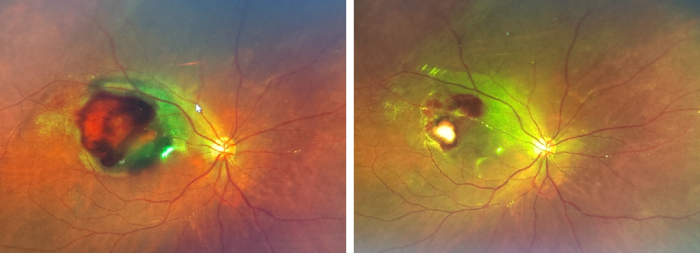 患者术前(左)和术后一周(右)黄斑下积血情况对比