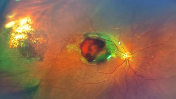 据了解,邓伯伯的右眼曾经历多次视网膜脱离手术,虽然视网膜已经平复,但黄斑区域——这个眼球视力最敏感且结构精密的部位,却仍然存在顽固的视网膜下出血,数月间难以自行吸收。黄斑作为手术的传统禁区,其治疗风险较高。但是若不及时清除黄斑下的积血,血液中的有害物质将对视网膜神经细胞产生毒性作用,导致黄斑萎缩,进而造成严重的、不可逆的视力损害。
