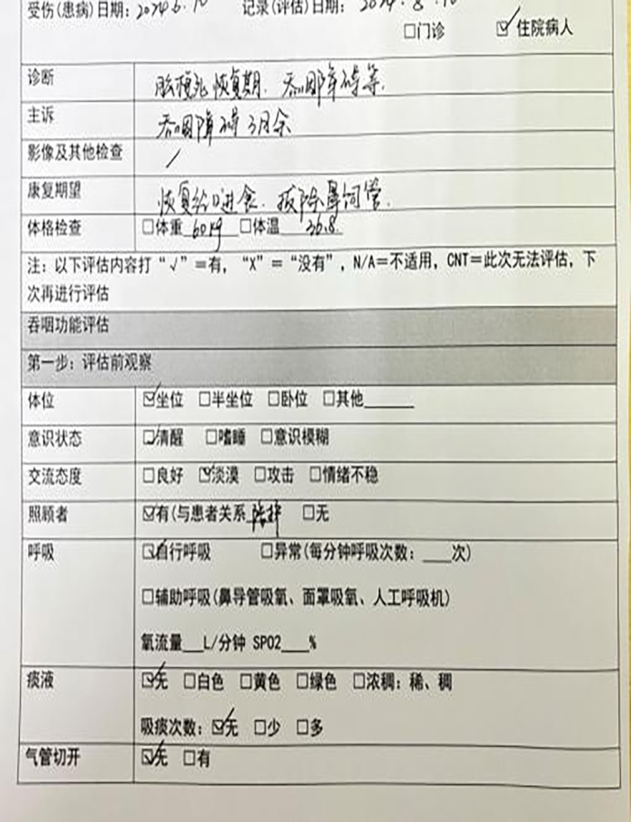 由于患者无法配合进行全名称电视荧光吞咽检查,康复团队邀请耳鼻喉科专家杨涛教授,用电子喉镜来仔细观察其喉咙情况,确保没有异物误入气管里。得到喉镜检查结果后,康复团队将患者鼻胃管更换为直径更小、材质更为柔软的间隙胃管,并运用药物雾化治疗和局部超短波治疗,减轻患者咽喉部水肿和疼痛症状。