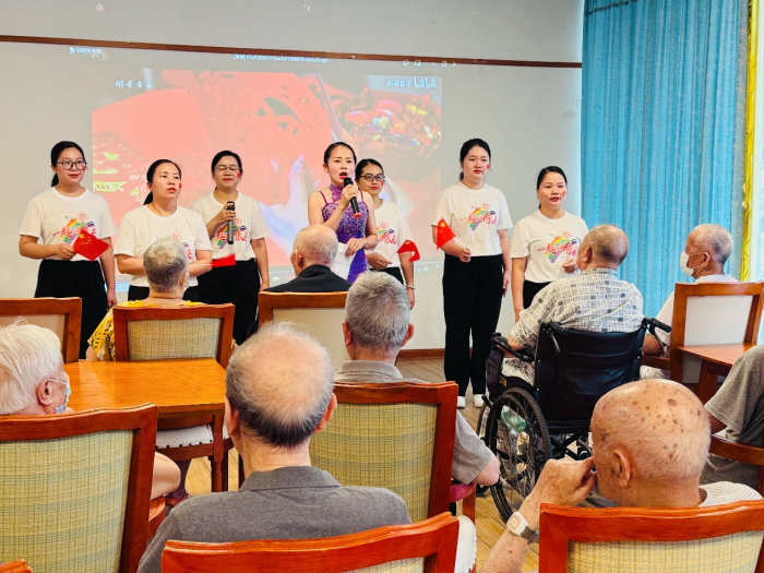 (图为学员们给老人演唱《相亲相爱一家人》)