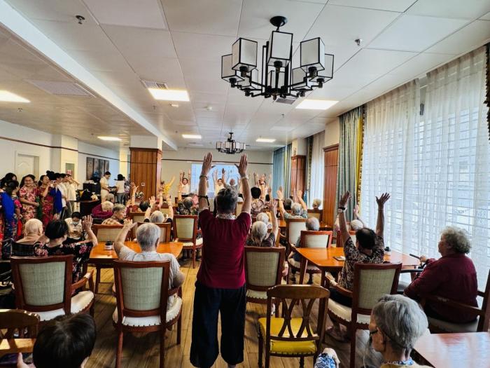 大家满怀热忱与关爱,热情地同老人们唠家常,详细询问他们的生活起居与身体状况,并通过向老年人进行健康科普知识宣教、八段锦教学、文艺表演以及倾听老年人讲革命前辈的红色故事等形式,同公寓的老年人一起庆祝中秋佳节。活动现场气氛热闹非凡,老人们个个脸上都洋溢着幸福的笑容。