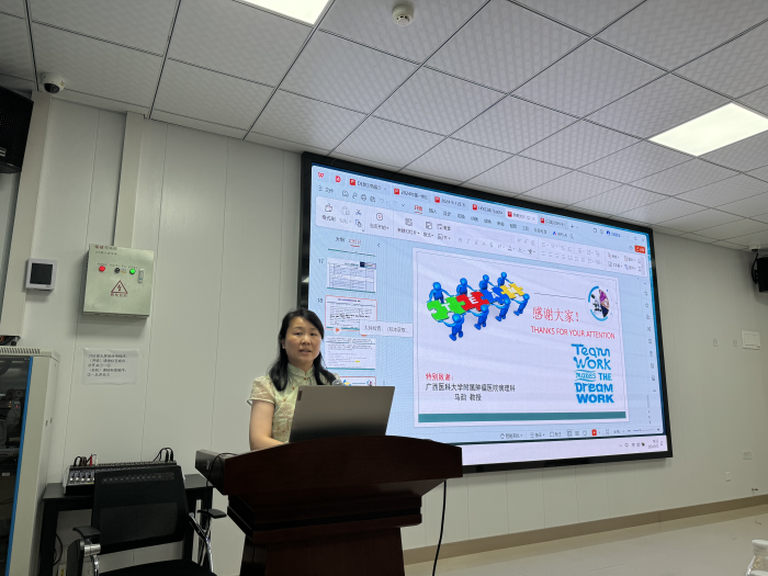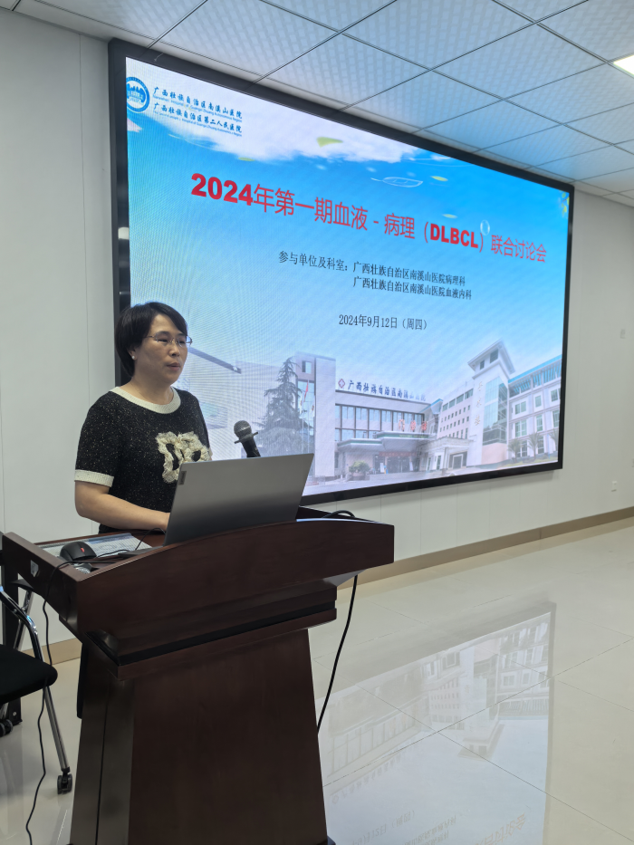 会议首先进行专业理论知识讲座学习,分别由医院病理科唐澄海副主任医师、李运千副主任医师介绍弥漫大B细胞淋巴瘤的免疫组化抗体应用解读及特殊类型大B细胞淋巴瘤相关专业知识。之后,进入实战病例分享阶段,由医院血液内科缪志超医师介绍一例难治性弥漫大B细胞淋巴瘤的临床特征,病理科李运千副主任医师、唐澄海副主任医师解读该患者的病理特点,罗泉芳主任、王薇副主任及全体参会人员进行病例讨论。接下来,病理科刘凯云及杨超月医师分别介绍淋巴瘤患者临床病例的镜下病理特点,罗泉芳主任、李运千主任及全体医务人员参与讨论。 最后,医院血液科主任罗泉芳在总结中表示,本次会议作为不同学科间的专业交流平台,不仅有助于推动各学科的共同发展进步,而且通过理论学习和病例分享,加深了与会者对弥漫大B细胞淋巴瘤的抗体应用以及特殊类型大B细胞淋巴瘤的理解。这种深入浅出的认识将转化为临床实践中的应用,从而进一步为患者提供更优质、更规范的诊疗服务。