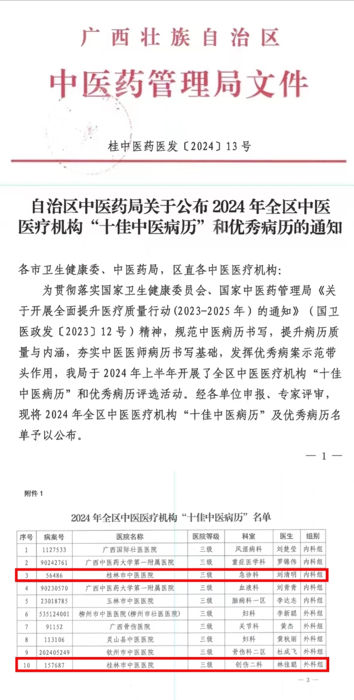近日,自治区中医药管理局发布了《自治区中医药局关于公布2024年全区中医医疗机构“十佳中医病历”和优秀病历的通知》,桂林市中医医院急诊科刘清明医生和创伤二科林佳聪医生书写的住院病历,从众多参评病历中脱颖而出,荣获2024年全区中医医疗机构“十佳中医病历”。