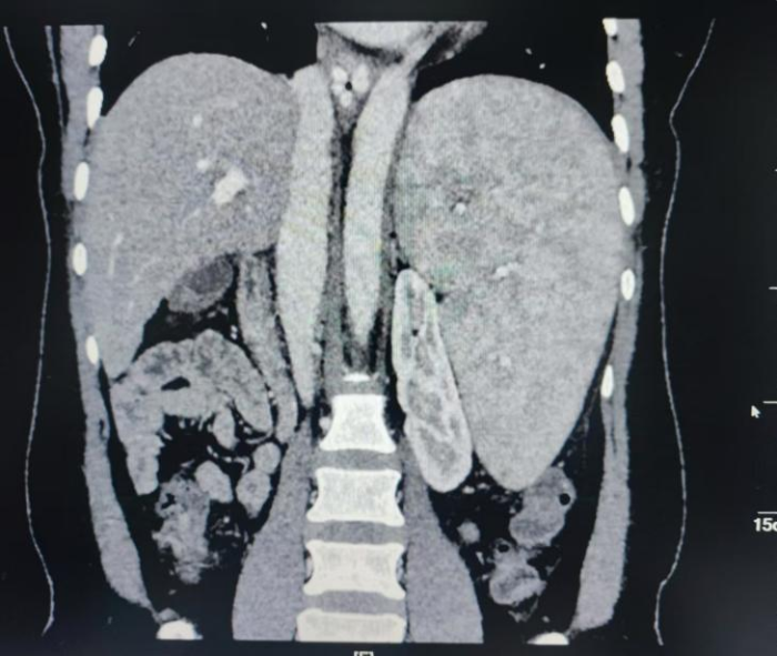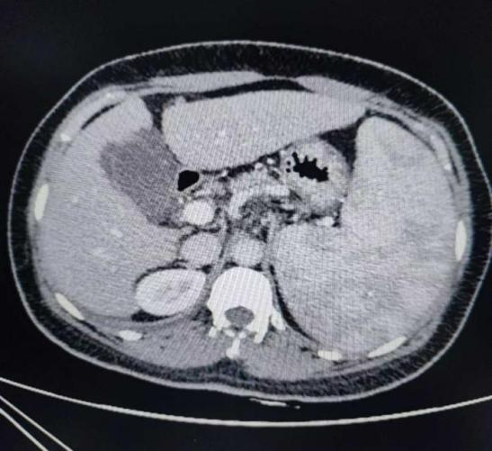 患者蒋女士今年50岁,从2018年至今已经有五次食管胃底静脉破裂出血病史,做3次胃底静脉硬化治疗。半月前胃底再次出血,入住自治区南溪山医院消化内科。经评估病情后考虑患者乙肝后肝硬化巨脾脾功能亢进,白细胞、红细胞、血小板“三系”减低,多次硬化剂治疗再次出血,有手术指征,经肝胆胰脾外科会诊后拟全麻下行全麻行腹腔镜下脾切除术+贲门血管离断术。