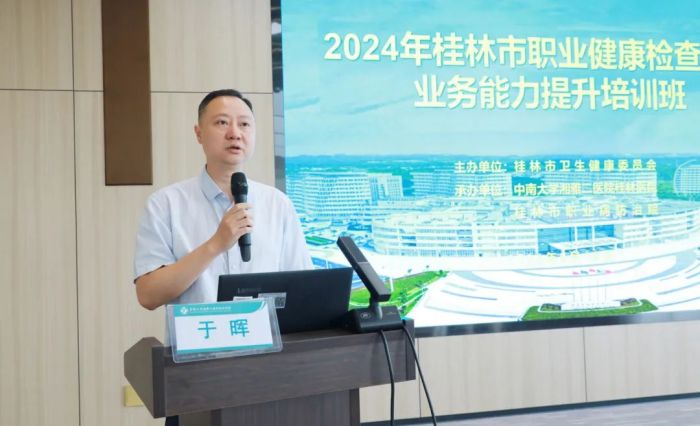 于晖充分肯定了近年来桂林市职业健康检查、诊断、康复工作所取得的成绩。他强调,职业病防治是关乎广大劳动者身体健康和生命安全的一项重大民生工程,职业健康检查机构要牢固树立法律意识、责任意识和服务意识,担当实干,切实维护劳动者职业健康权益。他表示,此次培训内容既贴近实际又符合当前职业健康工作的实际需求,具有职业健康检查的前瞻性和针对性,希望参训学员能够珍惜学习机会,积极思考、深入交流,不断提高职业病防治工作能力,促进职业健康检查机构知识共享与经验交流,不断助推全市职业健康工作取得新成效。