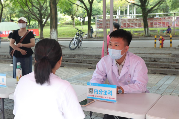 本次专家团队由医院副院长、工会主席唐芬带队一行11人为桂林理工大学的师生们提供了急救知识实操现场指导培训、内分泌疾病、呼吸疾病、骨科常见疾病问题问诊、皮肤疾病、中医及健康管理咨询等多项服务。此外,现场还设有血压、血糖免费测量点,方便师生们进行基础健康检查。
