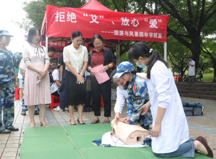 活动现场,南溪山医院专家正在为师生进行急救知识实操指导