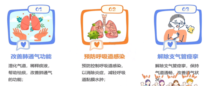 湿化气道,稀释痰液,帮助祛痰,改善肺通气的功能;