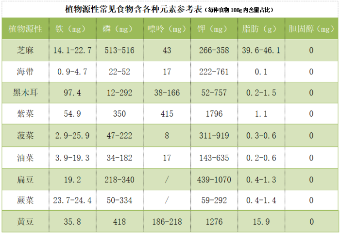 植物源性铁主要以无机化合物形式存在,铁元素的吸收率相对较低,但可以作为辅助补充。