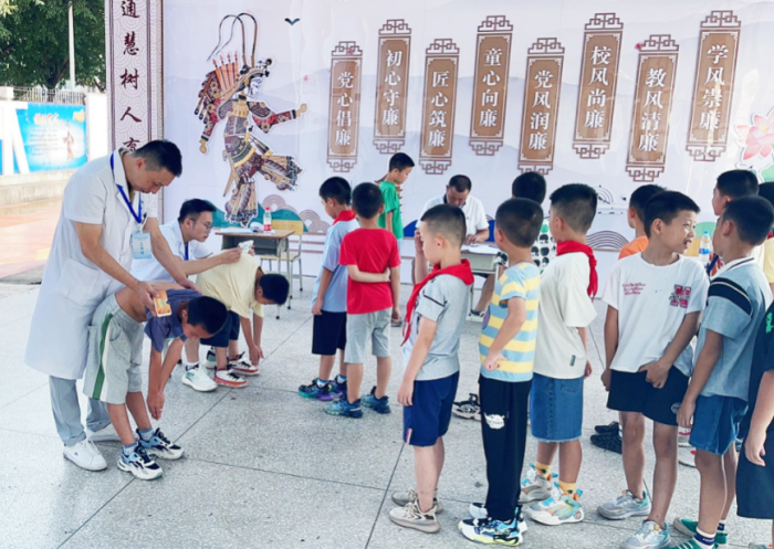 中南大学湘雅二医院桂林医院骨科一病区(关节、脊柱)医务人员来到桂林市汇通小学,为全校近三千名学生进行脊柱侧弯公益筛查。筛查现场,医务人员和志愿者通过眼观、手触、尺量等方式,为每一位学生进行初步的脊柱筛查。